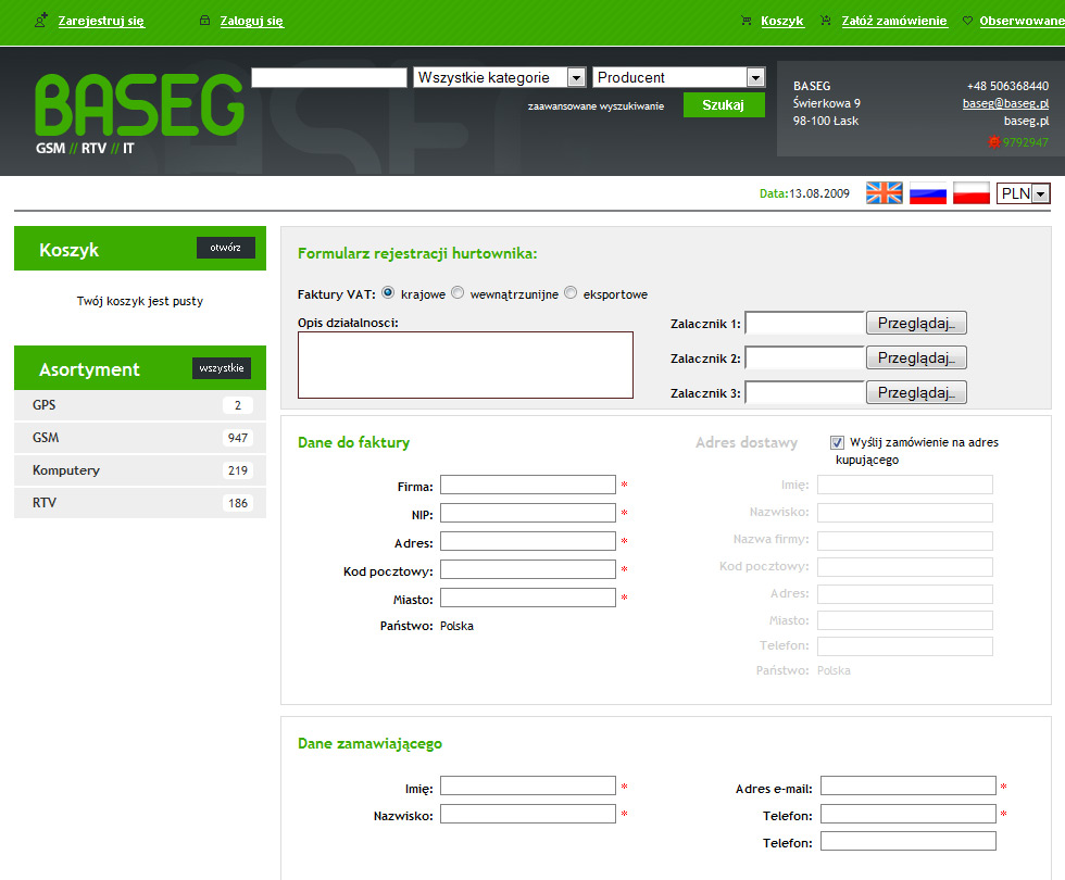 - Formularz rejestracji hurtownika z możliwością przesłania dokumentów